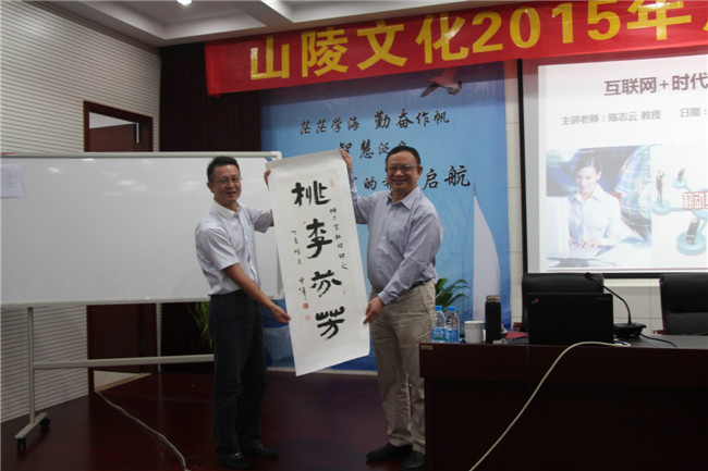 9月15日下午,陈志云教授再次来到山陵文化为我们的青年学员讲课。陈志云教授延续了他“授人以鱼不如授人以渔”的教学特点,为大家解读了如何在互联网+这个快速的时代里建设好团队的执行力。不久前,陈志云教授无偿为山陵文化捐赠了2000余卷的图书及图书架,丰富了员工的业务生活,山陵文化管委会主任顾雪峰书写了“桃李芬芳”四个字回赠予陈教授。